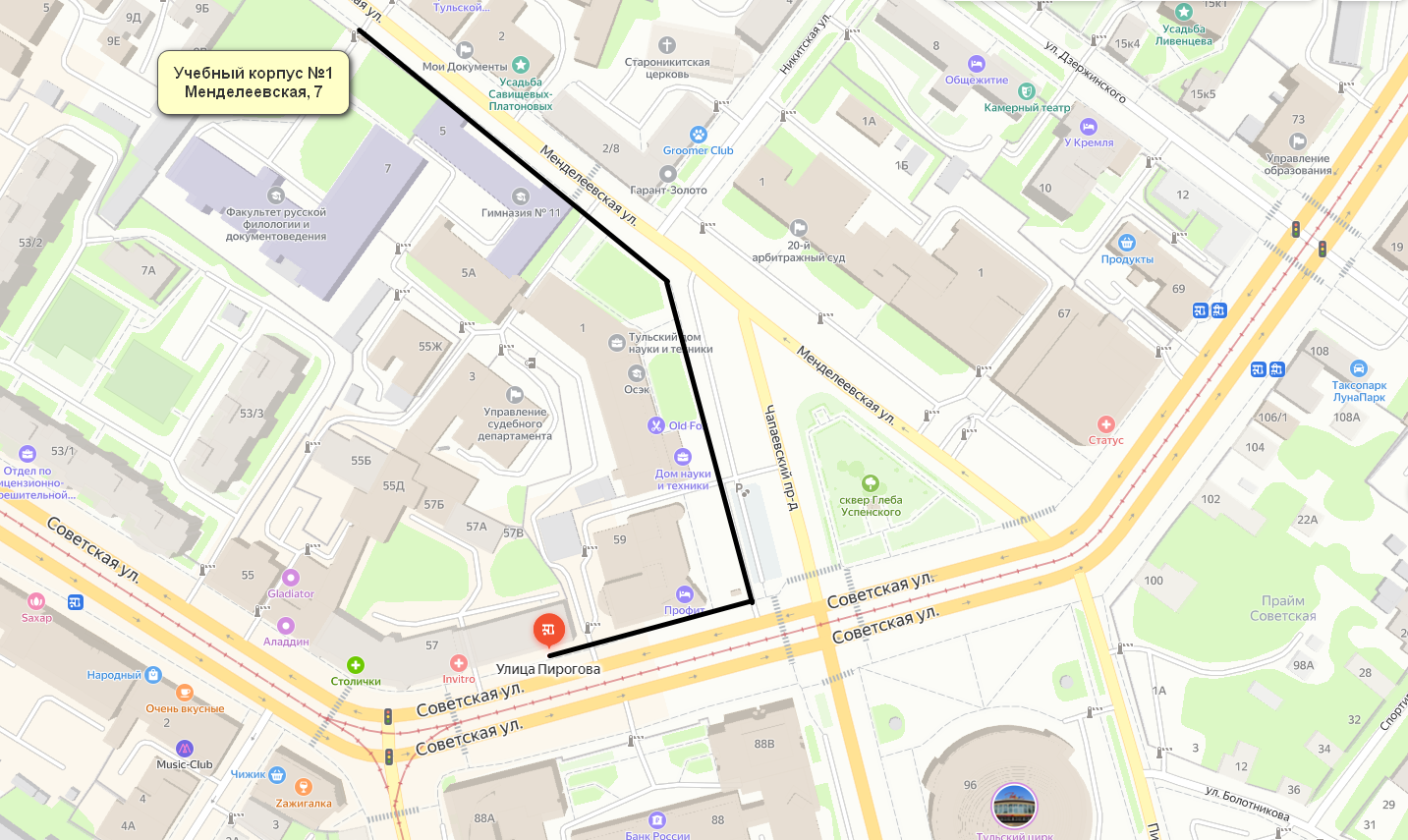 Расстояние до учебного корпуса №1, расположенного по адресу г. Тула, ул. Менделеевская, д. 7, от остановки общественного транспорта (автобус №№ 3,8,12,13,13а, 16, 18, 24, 28, 32Л, 40,44) составляет 420 м.