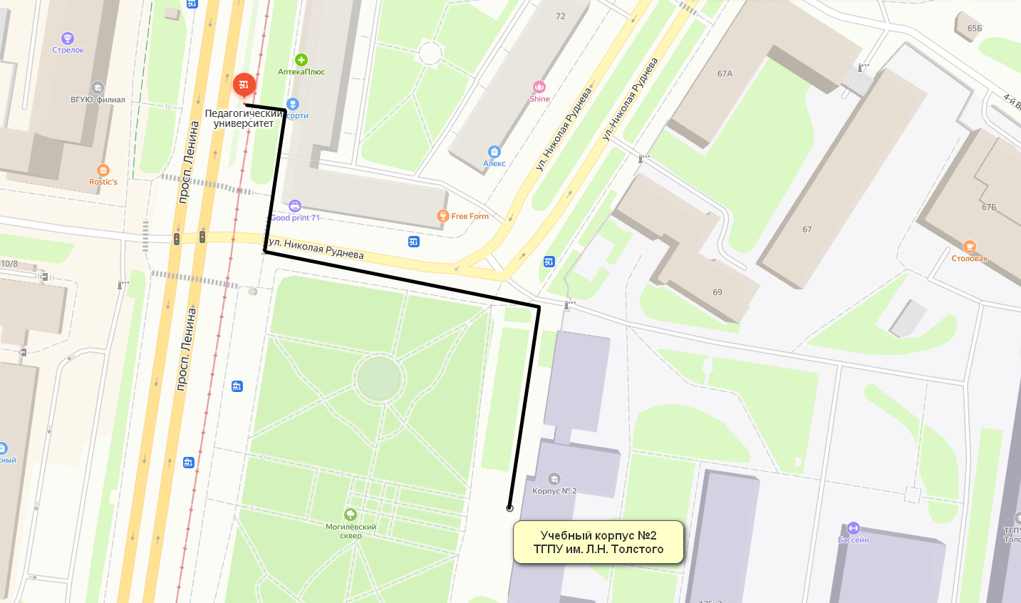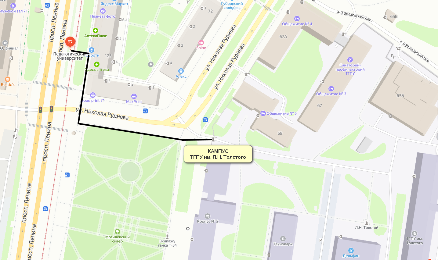Расстояние до кампуса, расположенного по адресу г. Тула, ул. проспект Ленина, д.125 от остановки общественного транспорта (троллейбус №№1,2,4,5 автобус №№ 7, 18, 25, 26, 27а, 28, 30Л, 34, 35Л, 38, 39а, 68, 114, 114к, 116, 117, 124, трамвай №14,12,13) составляет 193 м.