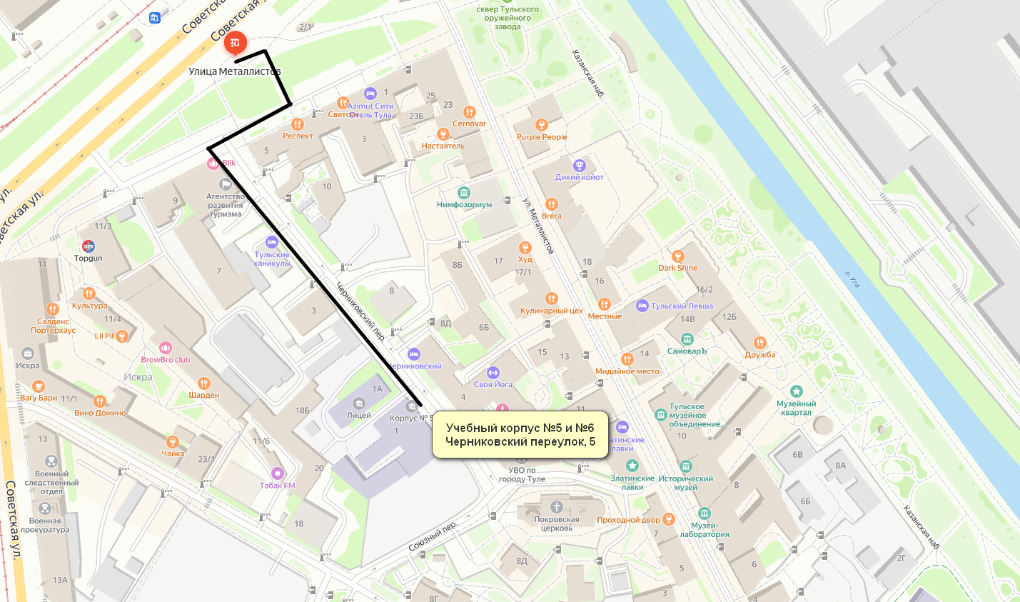 Расстояние до учебных корпусов №5,6, расположенного по адресу г. Тула, Черниковский переулок, д. 5, от остановки общественного транспорта (троллейбус №№2,4,6,7, автобус №№ 1, 8, 11, 11а, 24, 25, 27а, 32л, 34, 36, 44, 114к) составляет 252 м.