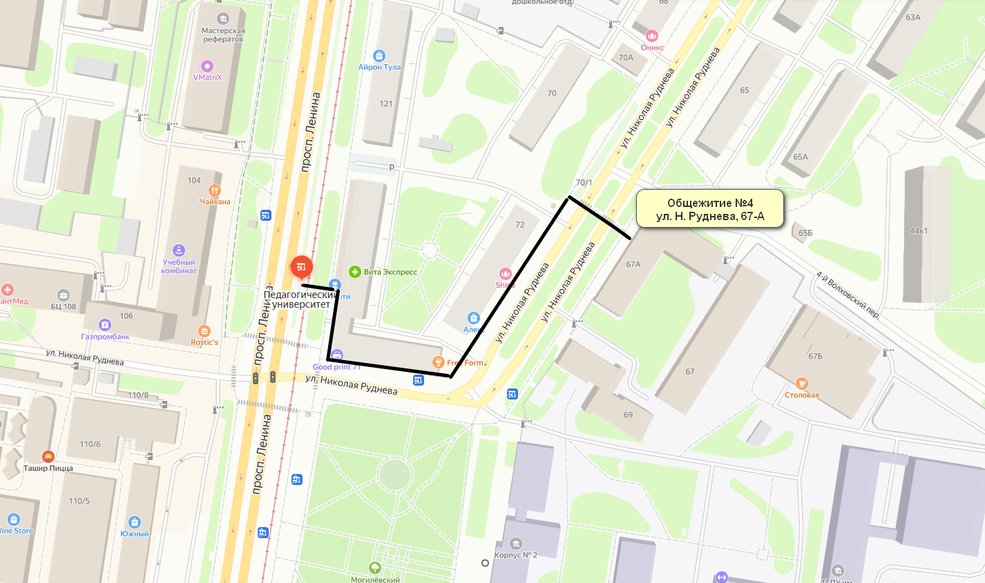 Расстояние до общежития №4, расположенного по адресу г. Тула, ул. Руднева, д. 67а, от остановки общественного транспорта (троллейбус №№1,2,4,5 автобус №№ 7, 18, 25, 26, 27а, 28, 30Л, 34, 35Л, 38, 39а, 68, 114, 114к, 116, 117, 124, трамвай №14,12,13) составляет 249 м.