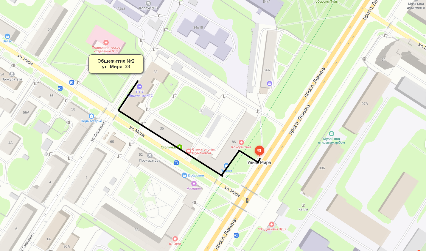 Расстояние до общежития №2, расположенного по адресу г. Тула, ул. Мира, д. 33, от остановки общественного транспорта (троллейбус №№1,2, автобус №№ 18,25,26,27а,28,34,35л,39а,114к) составляет 260 м.