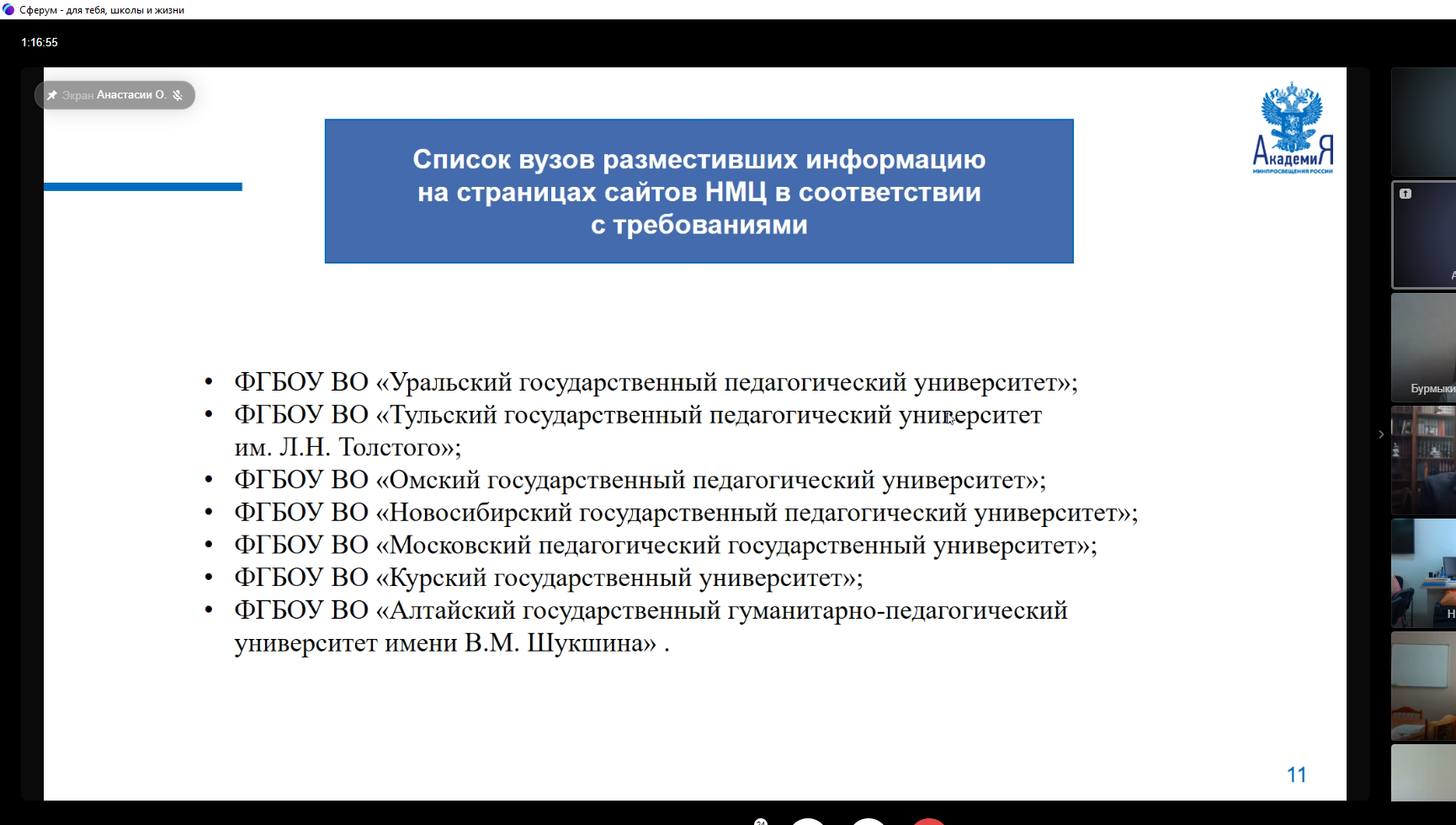 Вторым ключевым направлением совещания стали итоги проведенного специалистами Академии Минпросвещения мониторинга информации о деятельности научно-методических центров, размещенной на официальном сайте вуза. Отрадно, что ТГПУ им. Л.Н.Толстого вошел в число университетов, на 100% выполнивших действующие требования к официальным интернет-страницам научно-методических центров сопровождения педагогических работников!
